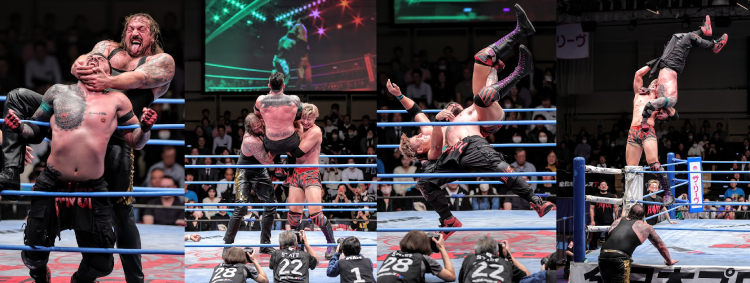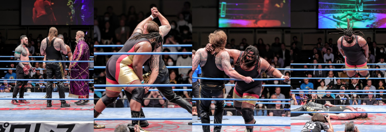 試合序盤は、ザイオン&オデッセイがスピードとコンビネーションでペースを握り、綾部を場外に追いやる場面も見られたが、タロースがその重圧で流れを断ち切ると、綾部もすぐに立て直しに成功。徐々に体格差とパワーの優位を押し出す展開に持ち込む。特に中盤以降、綾部の的確なカットと、タロースの圧倒的な肉体攻撃が機能しはじめ、ザイオンを分断する戦法が功を奏す形となった。