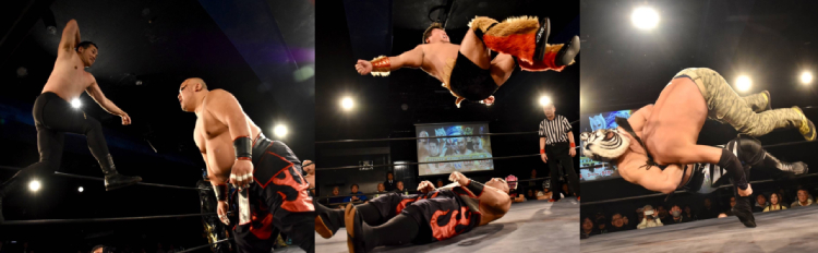 顔面を絞り上げる大森。そこからスリーパーに移行。苦しい浦野はなんとかロープに逃げた。山本SAN登場。フライングニーから、角度のえげつないバックドロップ。大森とのコンビネーションのダブルエルボー。浦野はグロッキー状態。目が飛んでいる。大森は高いバックドロップ。カウント2でなんとか返す浦野だが虫の息だ。大きな声を出しながら喰らいつく浦野をコーナーに詰める大森。ここで起死回生のラリアットが大森にヒット。自軍コーナーにやっと戻って佐藤とタッチ。