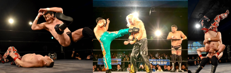 HANAKAIDOはチームワークと勢いでCOMBOの象徴を掴み取れるのか! 先発は山本SANと、佐藤将太。山本SANには「パパ、頑張れ!」の声が。ご子息か。佐藤ラリアットを交わし、バックドロップからのフォールへ。山本SANこれを凌ぐ。佐藤蹴りを山本SANの胸板へ。強烈な蹴りだが、山本SANには効かない。ロープに振られる佐藤を山本SANはドロックキック。自軍コーナーで大森隆男にバトンタッチ。佐藤エルボー、蹴りを放つが大森を倒せない。