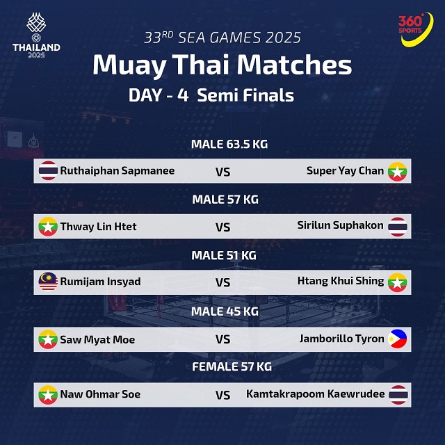 大会4日目の準決勝戦に5選手が参戦、2日め14日に勝利した63.5㎏スーパー・ヤイ・チャンと女子57㎏ナウ・オマー・ソーが判定敗け、ONE参戦中の57㎏スイ・リン・テート、51㎏タン・チンシェン、45㎏ソー・ミャット・モも判定敗けで全選手判定敗けでトーナメントから姿を消した。