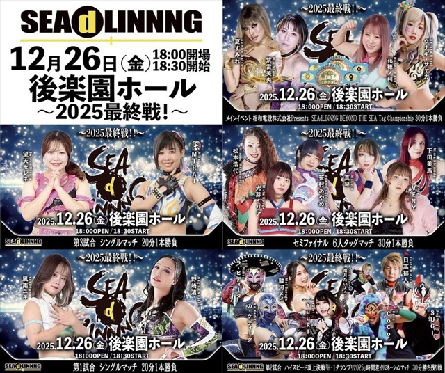 年内最終戦となる後楽園大会の全カードが決定。花穂ノ利&ウナギがタッグ王座に挑戦するほか、セミの6人タッグには光芽ミリアが抜擢。爪跡を残せるか? また、望天セレネはMIRAIと初シングル、ハイスピードは頂上決戦となる7選手参加のイリミネーションマッチが行われる。風南ユキも野崎を相手に意地を見せたいところだ。魂の女子プロレス、2025年の集大成!
