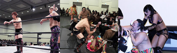 「HELLO」の曲でアップタウンの3選手が登場。黒潮はいつも通り自由奔放に動き回るが、立花誠吾、花園桃花も自由だ。しゃぼん玉を客席にかけたり、推し選手のタオルを奪っては記念撮影したり…。先にリングインしていた田中稔たちはイライラの頂点。一旦曲が終わり、黒潮は控え室に戻るとアンコール。再び曲が流れるが、田中たちは耐えきれず3人を急襲!