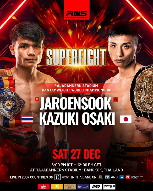 12月27日に行われるタイ・バンコクのラジャダムナンスタジアムにて毎週土曜日開催されるRWS(Rajadamnern World Series/ラジャダムナン・ワールド・シリーズ)「ラジャダムナンスタジアム80周年記念大会 R80」。メインはラジャダムナンスタジアム認定スーパーウェルター級タイトルマッチで外国人王者ダニエル・ロドリゲス(スイス)vs.ラジャ・ルンピニー、ONE、WBCムエタイ王座も制覇した日本でもお馴染みのペットモラコット(タイ)だが、日本からRISE世界スーパーフライ級王者・大﨑一貴(OISHI GYM)がジャルンスック・ブーンラナームエタイ(タイ)とラジャダムナンスタジアム認定バンタム級タイトルマッチを行う。両者は2023年12月16日「WORLD SERIES 2023 Final Round」で肘なし首相撲制限のRISEルールで闘って大崎が延長スプリット判定で勝利しており、今回はムエタイルール&ジャルンスックの地元での再戦となる。大崎は、元々ムエタイルールでWBCムエタイ日本やルンピニージャパンのタイトルを獲得しているが、ムエタイルールでの試合は久々となり、不利は否めない。
