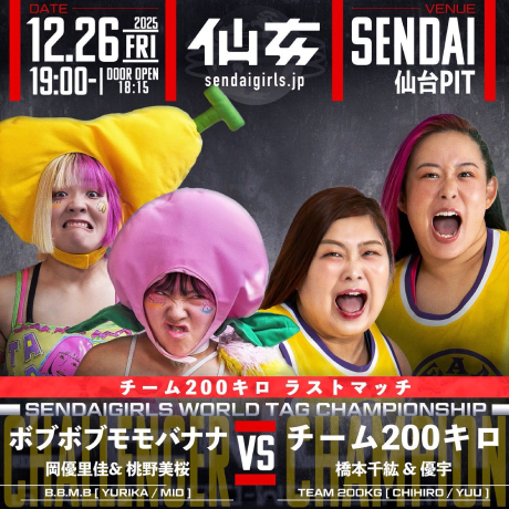 優宇(Yuu)が公約通り引退、最後の試合はセンダイガールズワールドタッグ選手権。ボブボブモモバナナ(岡優里佳&桃野美桜)に王座を明け渡しての有終の美であった。仙台PITは超満員札止めになっている。