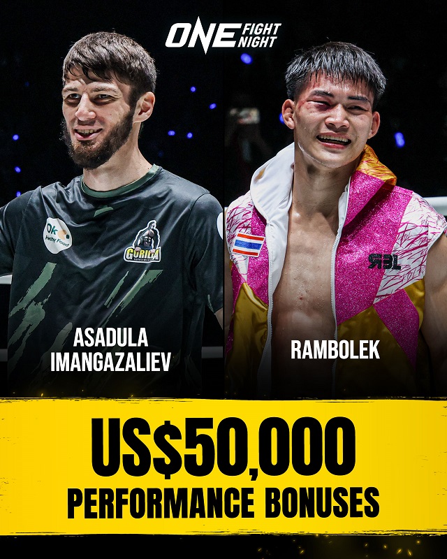パフォーマンスボーナス5万USD(約778万円)を獲得した左手側より第8試合アサドゥーラ・イマンガザリエフ(ロシア)第9試合ランボーレック・チョー・アッジャラブーン(タイ)の2選手