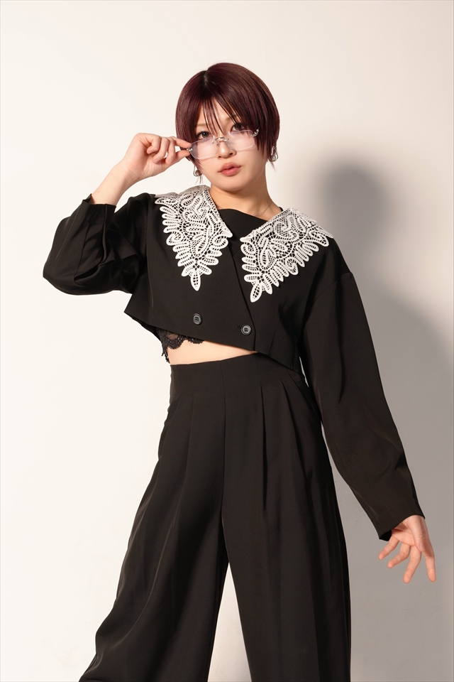 深紅のショートヘアに、青と黒を基調としたラテックス風の新コスチューム。床に座り、膝を抱えながら鋭い視線を投げかけるポーズは、安納が掲げてきた「絶対不屈彼女」というイメージを、より成熟した形で体現するものとなった。