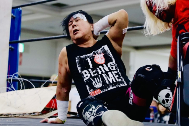 1月18日広島産業会館大会で、自身の得意技であるテーブルパイルドライバーを失敗し、机から落下。あわや大怪我の危機だった。