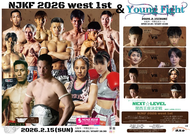 2月15日(日) NJKF WEST誠至会主催興行 『NJKF 2026 west 1st & Young Fight』の二部構成大会が大阪市平野区民ホールで開催された。一部「Young Fight」では越野廉成(NJKF 誠至会)とマグナムカンタ(直心会)が強さをみせつけ、本戦二部「NJKF 2026 west 1st」は二つのベルトを賭けた闘いで、