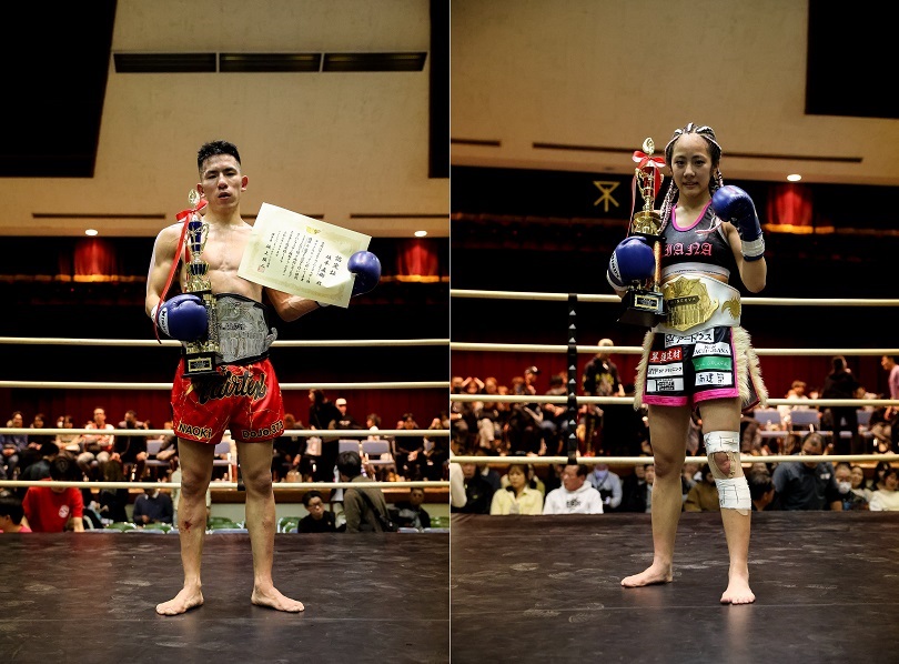NJKF 2026 west 1st では、NJKF スーパーフェザー級王者・坂本 直樹(NJKF 道場 373)とミネルヴァ・アトム級暫定王者・RIANA(NJKF TOKEN KICKBOXING GYM)の2新王者が誕生した。(トップ写真:坂本 直樹とRIANAの新王者)