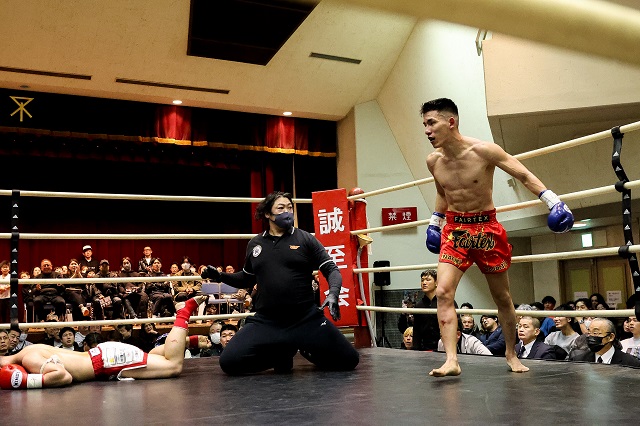 2R 越野がボディーストレートや膝をクリーンヒットさせ、滑飛が徐々に攻めづらくなった一瞬を突いたカウンターの右フックが滑飛の顎を捉えダウンを奪う