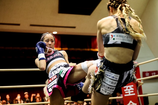 3R 会場の熱量は最大に達し、両者の気持ちが強く出た試合展開となった。撃ち合うシーンが多く見られ共に多くの被弾をしつつも最後まで果敢に攻め続けた。1R から両者一歩も譲らない攻防が続き、首相撲の展開が多く見られた。終盤では激しい打ち合いが繰り広げられ会場全体が熱気に包まれた。全体を通して徐々に RIANA がペースを掴んでいきベルトを掴み取った。