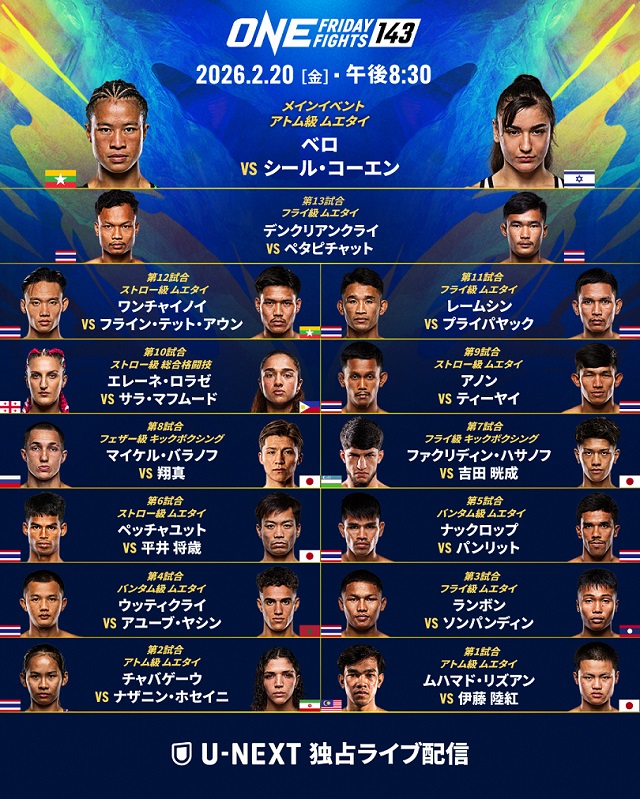 2月20日(金)タイ・バンコクのルンピニースタジアムで開催される『ONEルンピニー/フライデーファイツ143』の前日計量とフェイスオフが終了。メイン(第14試合)は日本ラウェイ大会にも来日参戦経験有、ミャンマーでラウェイ女子ベルトも獲得。政変クーデター後タイに拠店を移し、バンテージ・ムエタイ“カッチューア”で2度ベルトを獲得して、ONEで2勝1KO1敗と激戦を展開しているベロ(ミャンマー)が、ONE3戦全勝1KO中のシール・コーエン(イスラエル)と対戦する。両選手共タイに在住して、タイガージム(ベロ)フェアテックスジム(シール・コーエン)でトレーニングを積んでおり、女子らしからぬ打撃戦を展開するこの試合勝者は、次期アトム級王座挑戦に近づくと予想される。