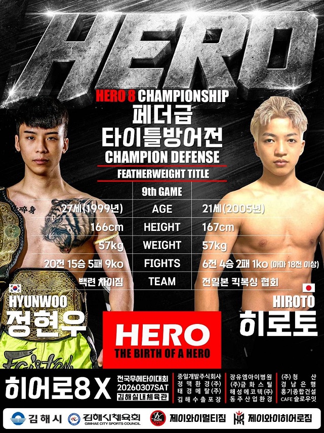 3月7日(土)韓国釜山で開催されるキックボクシングイベント「HERO“THE BIRTH OF A HERO”」に全日本キックボクシング協会韓国支部公式派遣マッチとしてHEROタイトルマッチに臨む広翔/ひろと(稲城ジム/全日本スーパーバンタム級10位)勇生/ゆうせい(ウルブズスクワッドキックボクシング道場/全日本スーパーライト級6位)と対戦するジョン・ヒョヌとキム・ビョンスのコメントが届いた。