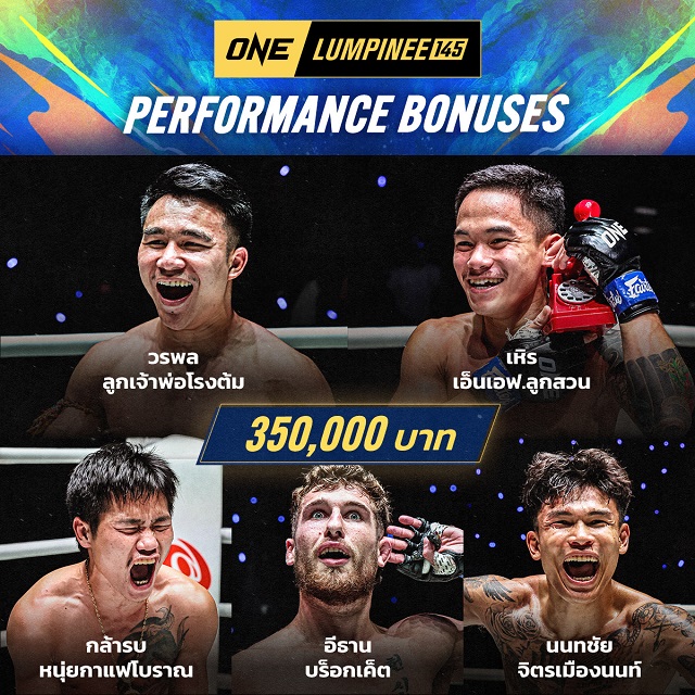パフォーマンスボーナス35万Bath(約173万円・11,000USD)を獲得した上段左手側より、第14試合ワラポン・ソー・デチャパン(タイ)第13試合ハー・NFルクスアン(タイ)下段左手側より第11試合クラロップ(タイ)第9試合イーサン・ブロケット(ニュージーランド)第7試合 憂也(日本)第2試合 政所仁(日本)の3選手。