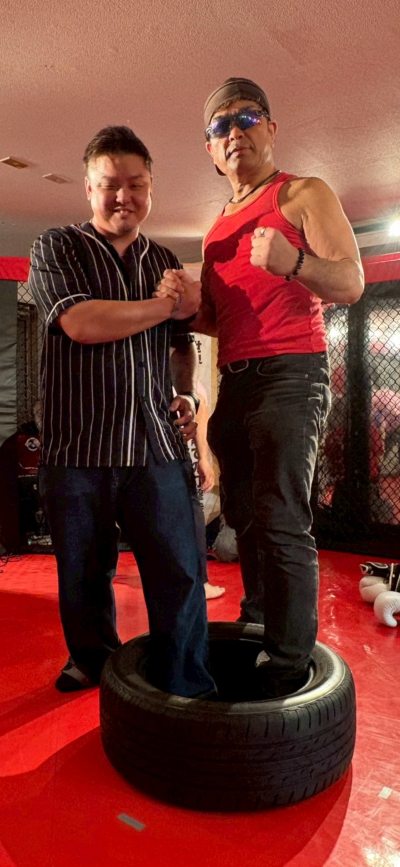 昨年オープントーナメントを生観戦したにっけん君は、「多分、この中なら自分が一番強いと思う。」とタイヤファイト連盟会長の入江(秀忠)に発言しており、本試合はなんなくクリアし、今年6月26日に開催されるタイヤファイトJAPANの覇権を狙いたい所である。