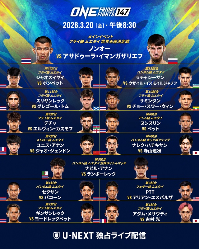 3月20日(金)タイ・バンコクのルンピニースタジアムで開催された『ONEルンピニー/フライデーファイツ147』。メインは39歳の古豪ノンオー(タイ)がONE2本目のベルトを目指し、ONE全勝のアサドゥーラ・イマンガザリエフ(ロシア)とのムエタイ・フライ級王座決定戦決定戦に臨んだがKO完敗、しかしイマンガザリエフの計量失敗により王座は空位のままとなった。(ノンオー勝利のみ新王者)