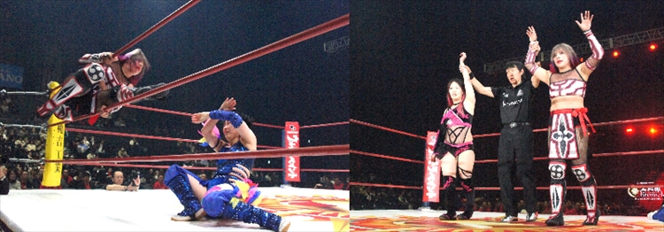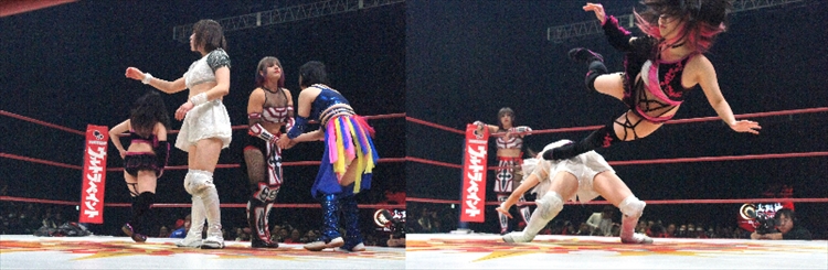 スタートは豊田紗也夏と志真うたのエルボー合戦から。交代した優華が豊田にドロップキックをかますが、豊田は叔母譲りの柔らかいブリッジでかわす。そしてAKARIと志真うたのダイナミックなドロップキック合戦から、AKARIは交代した優華をサーフボードで締め上げる。終盤に差し掛かると、豊田のコーナー最上段からのミサイルキックが志真うたにヒット! 最後は豊田が志真を片エビ固めでフォールした。