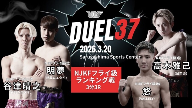 3月20日 神奈川県・猿ヶ島スポーツセンターで開催されたNJKF「DUEL.37」。トリプルメイン2試合はNJKFフライ級ランキング戦&次期王座挑戦トーナメントでONE参戦中の谷津晴之 (新興ムエタイジム)と悠 (VALLELY)がKO勝で決勝戦で争い、勝者が王者・西田光汰(西田キックボクシングジム)に挑戦する。