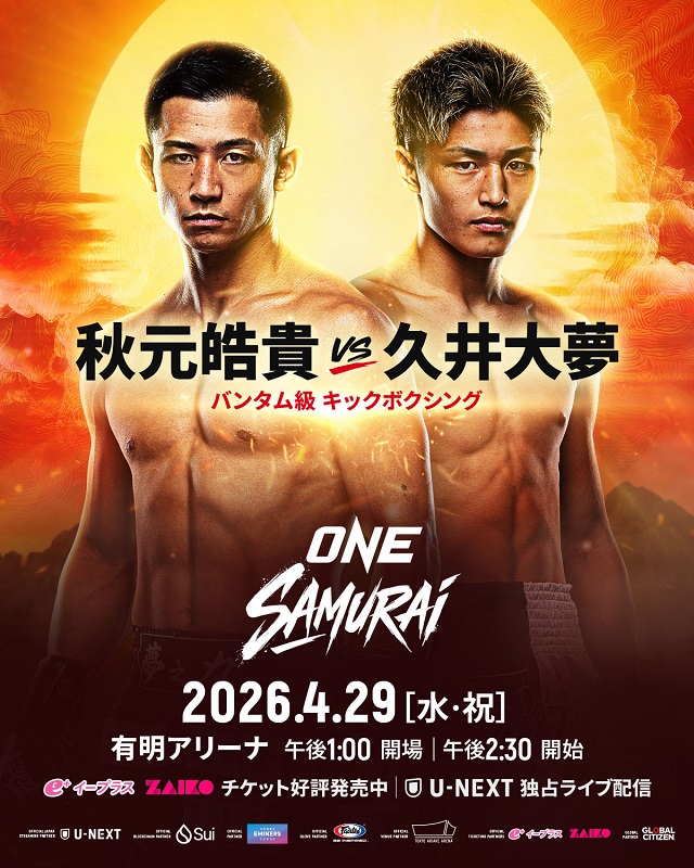 格闘技のビッグプロモーションであるONE CHAMPIONSHIPが4月29日(祝水)東京・有明アリーナで日本オリジナル新シリーズとして開催される「ONE SAMURAI」。最終追加カードとしてONE元キック王者・秋元皓貴 vs. ONE初参戦となるKNOCK OUTの代表選手・久井大夢が発表され、全試合通常の日本大会ならメイン級の豪華カード15試合が揃った。
