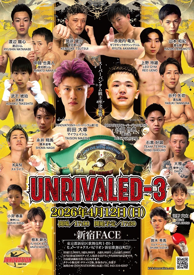 閉館が発表された東京・新宿FACEにて4月12日(日)開催されたJAPAN KICKBOXING INNOVATION主催キックボクシング興行「UNRIVALED-3」。メインのINNOVATION︎スーパーバンタム級(55.34kg)王座決定戦は、最近KNOCK OUTを主戦とする前田大尊(20歳/172㎝)が、関西を主戦とする辻岡怜恩(22歳/161㎝)を序盤からリーチ差を利したパンチ・キック、時折バックキック出して追い込み、4Rボディを効かせダウンを奪う、辻岡もフラフラになりながらもノーガード状態での大振りのフックを振るい抵抗、倒しきれなかったが完勝で前田が王座を戴冠した。