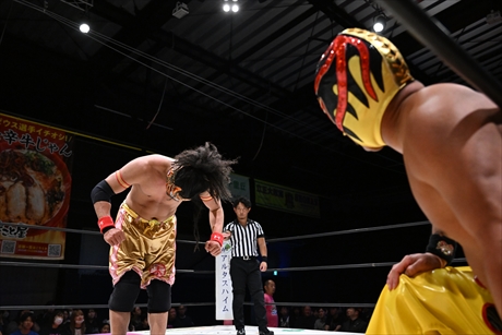 強烈なチョップ合戦を打ち勝ったタコヤキーダーが一気呵成に攻め込むが、最後は一撃必殺をスタナーで迎撃したTiiiDAが逆転勝利した。