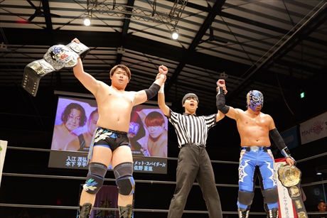 対するは昨日の大会でタッグ王座を防衛した佐野とライトヘビー級王座防衛したスパイダーの王者コンビ。