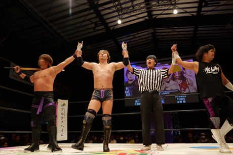 龍飛鳳舞から龍蟠虎踞を狙うが三原は力づくで松房をコーナーに叩きつけキン肉バスターを売り出すがカウント2、ならばとメガトンラリアットが完璧に決まったと思った瞬間再び松房が龍胆で三原を締め落とし、最後は両腕を掴んでの膝の4連発。